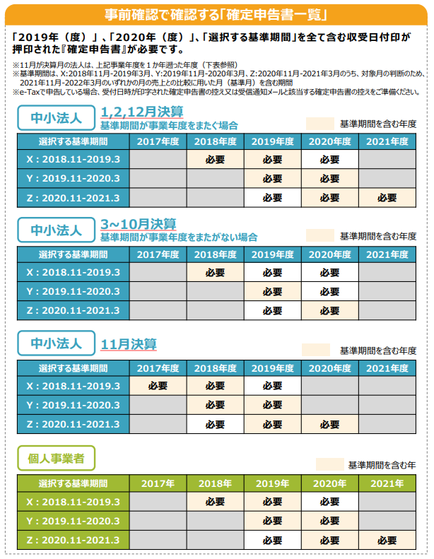 ※基準(売上減少前の売上証明)とする年(度)や、法人の場合は決算月により必要な確定申告年度の書類が変わりますのでご注意ください。詳細は以下一覧をご確認ください。